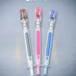 Seu corpo é a seringa e sua tampa é a ampola. Escrita fina preta macia perfeita. Design nas cores branca, rosa e azul.